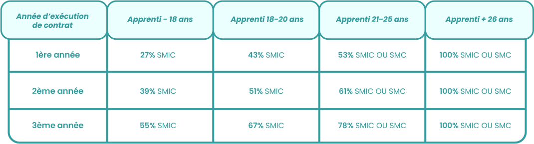 La rémunération est également calculée en pourcentage du SMIC, mais elle dépend :